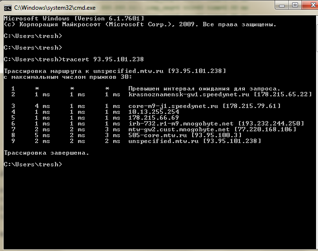 2. В появившемся окне набираете команду : tracert 93.95.101.238